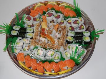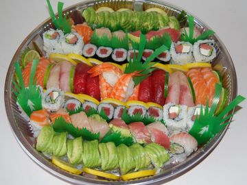 16 pieces of Caterpillar Roll, 16 pieces of Rainbow Roll, 16 pieces of Philadelphia Roll, 12 pieces of Tekka Maki, 16 pieces of Salmon, Tuna, Yellowtail and Cooked Shrimp Nigiri